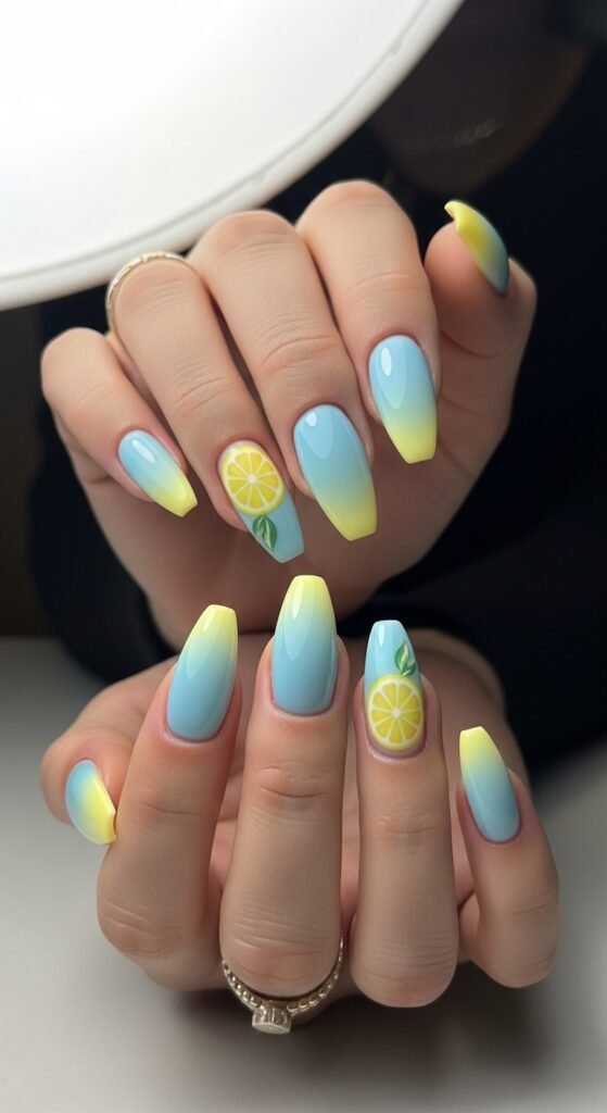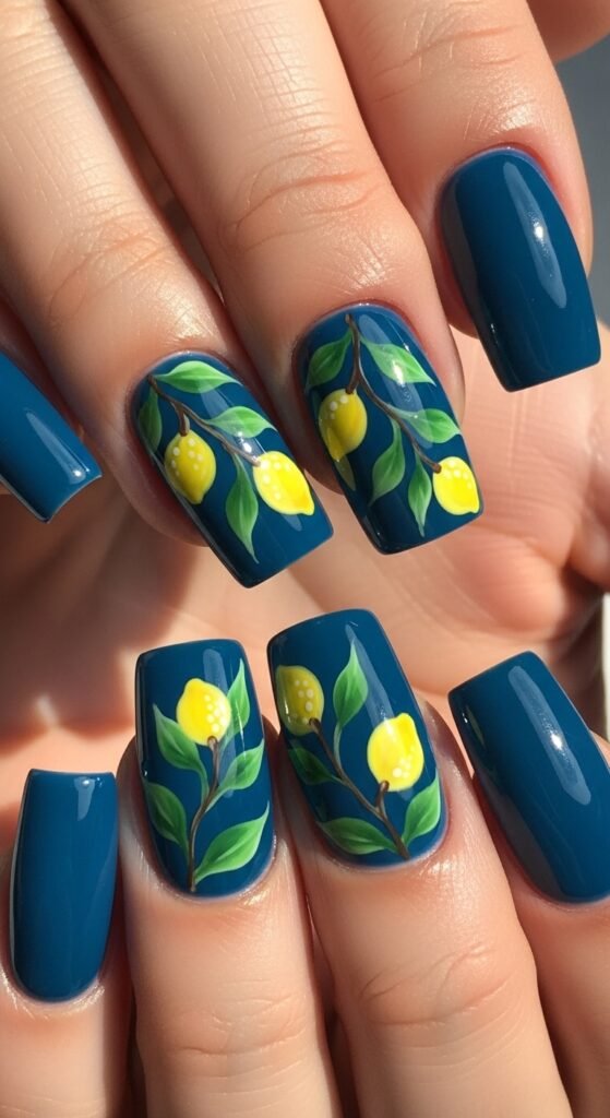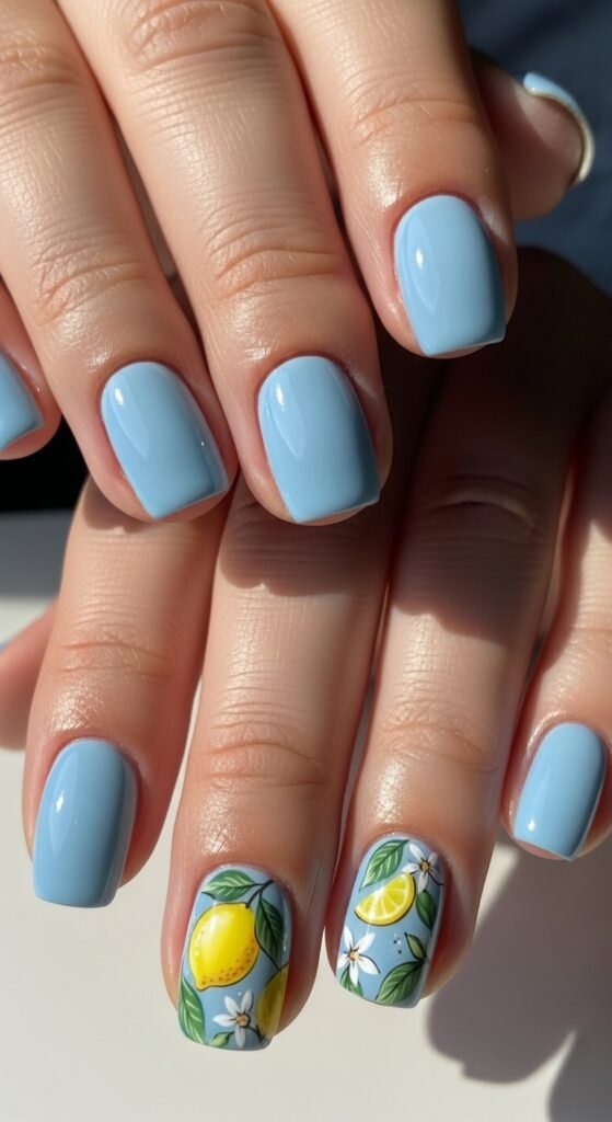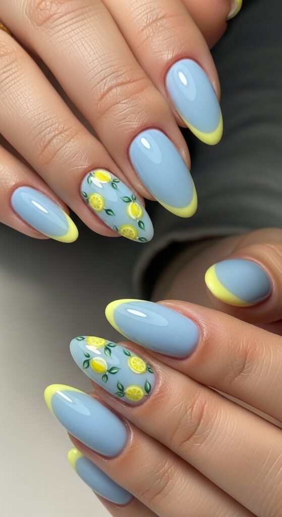 Mix textures for a modern twist—matte blue nails with shiny lemon art.
