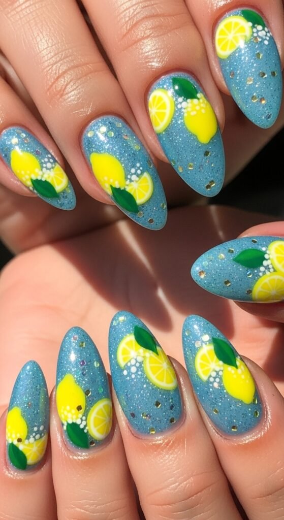 11. Glitter Blue Lemon Nails