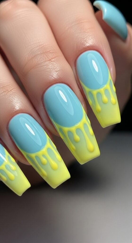 12. Lemon Drip Nails on Blue Base