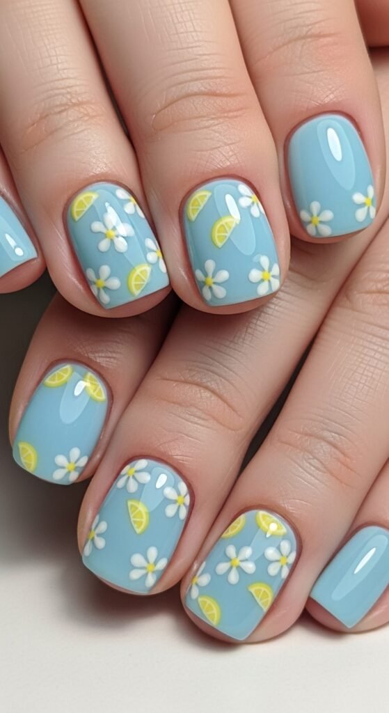 13. Baby Blue Floral Lemon Nails