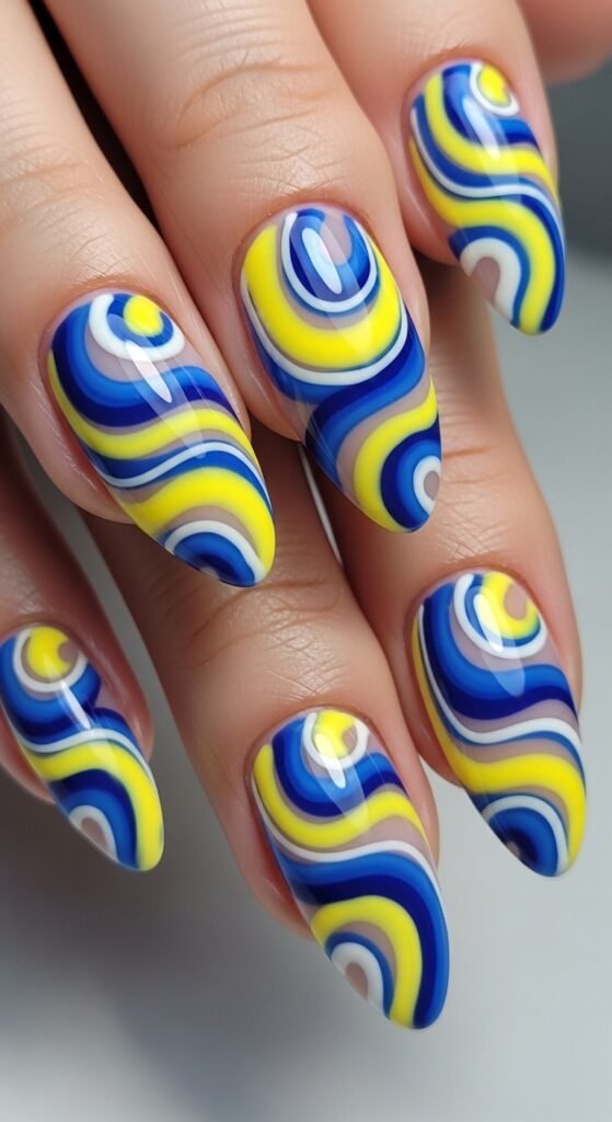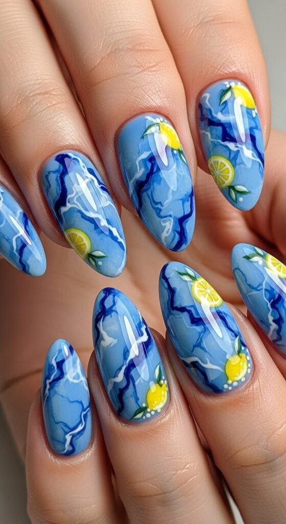 6. Lemon and Blue Swirl Nails