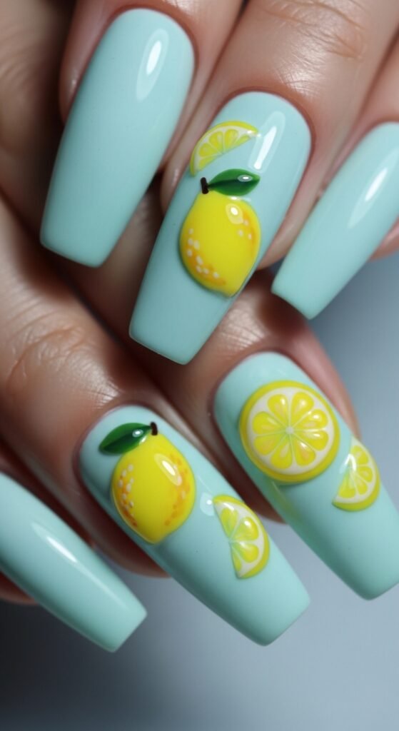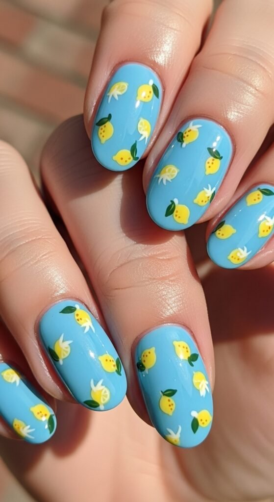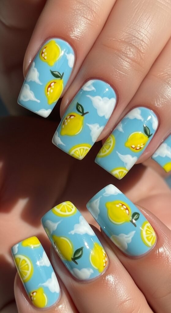 These nails look like a sunny sky with lemons floating like clouds—playful and dreamy.