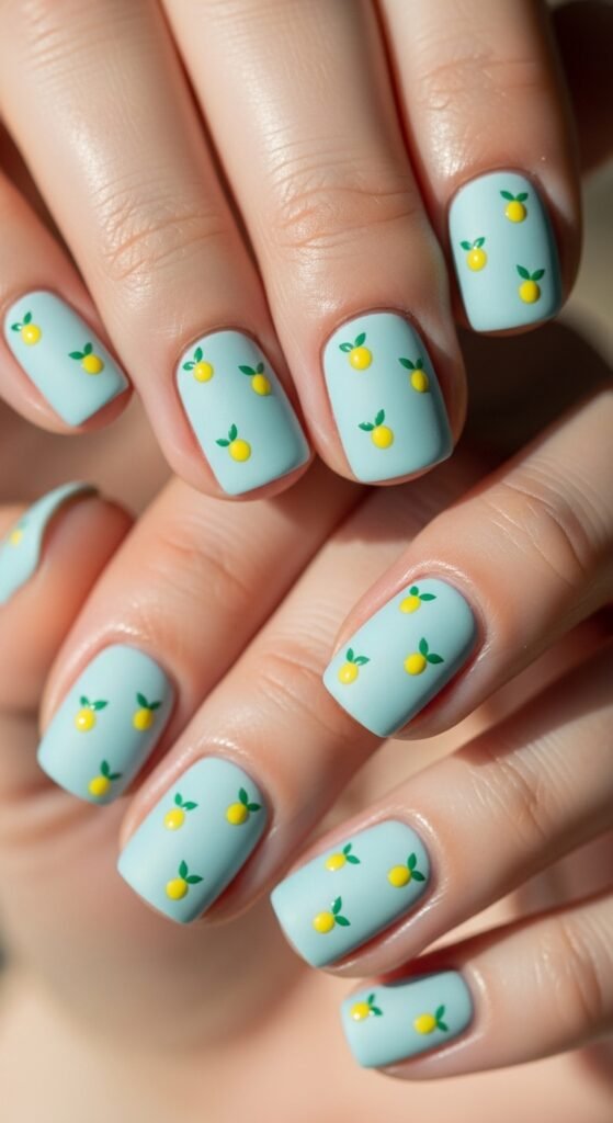 For a clean girl aesthetic—tiny lemon dots on a soft blue base.