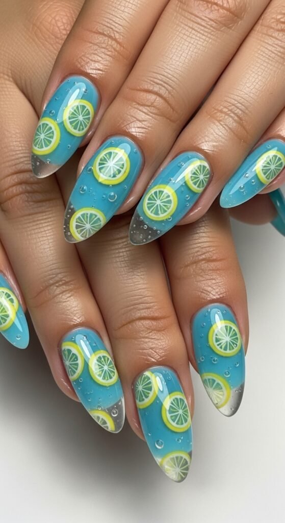 18. Blue Jelly Nails with Lemon Art