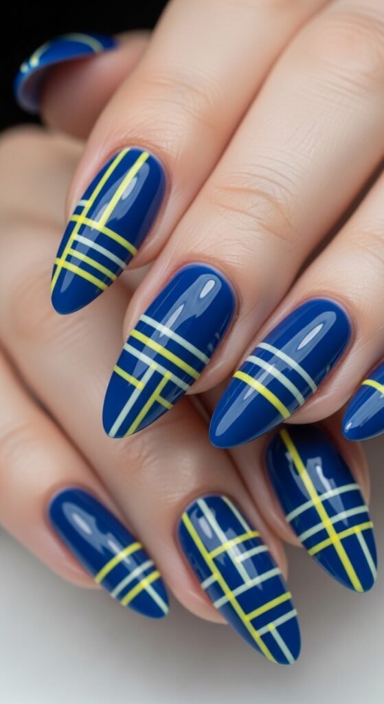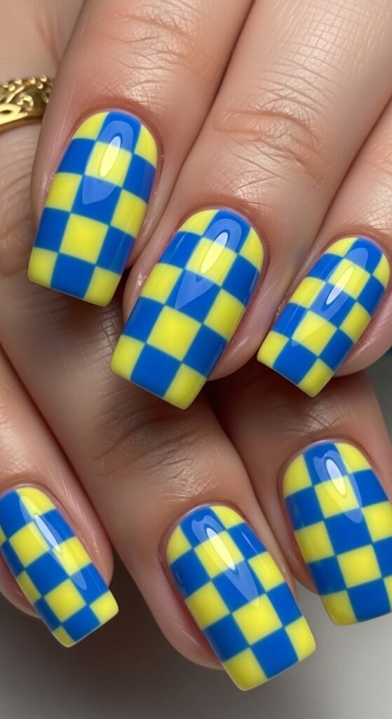 23. Lemon and Blue Checkerboard Nails