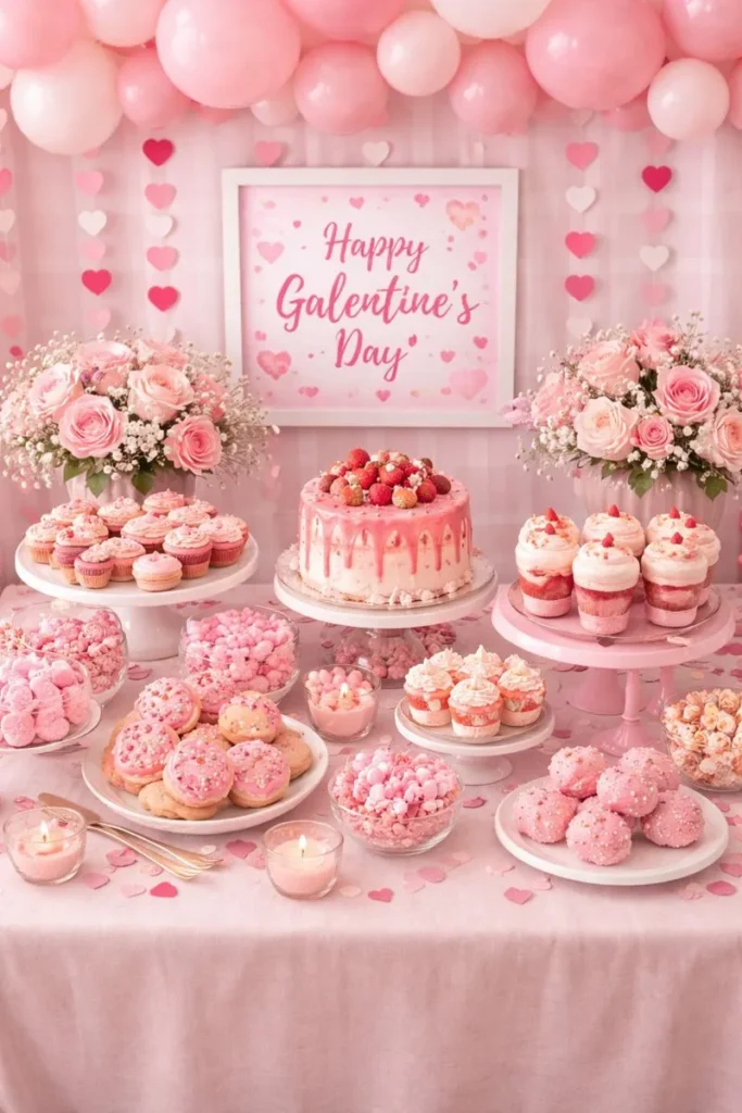 Create a dessert display filled with cupcakes, macarons, and chocolate treats in Valentine shades. Add cake stands and florals to make it look bakery-worthy.