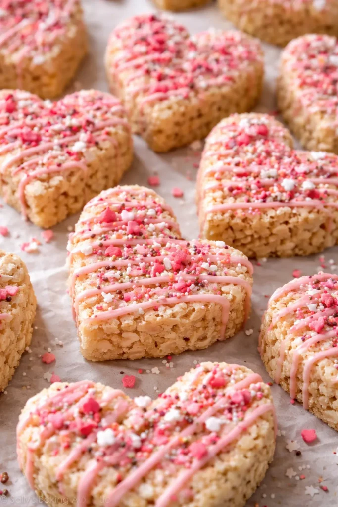 Classic Rice Krispie treats shaped into hearts are always a hit. Dip them in chocolate and add sprinkles. They’re chewy, sweet, and easy to make. Kids love the soft texture and colorful topping. Great for gifting or party trays. Wrap them individually for extra charm.