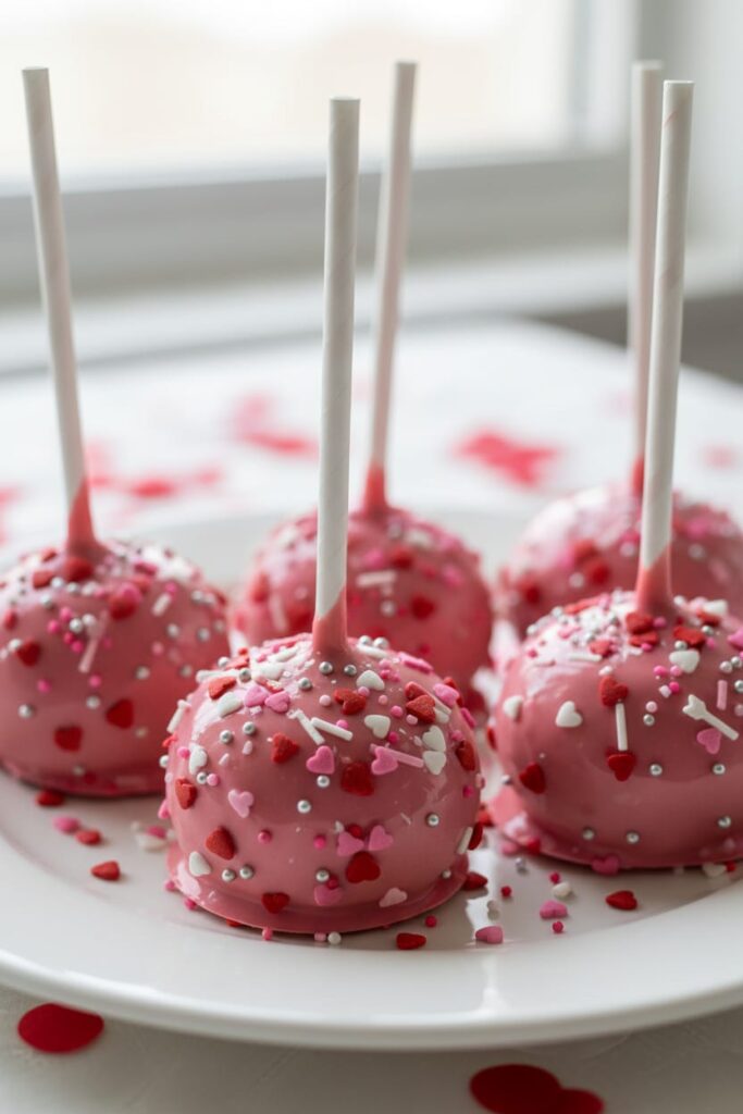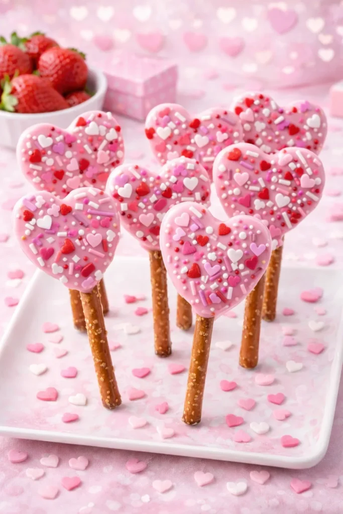 Twist soft pretzels into heart shapes and bake until golden. Dip them halfway into pink or white chocolate. Add festive sprinkles for extra fun. These are salty, sweet, and irresistible. Kids love holding them like lollipops. Perfect for school parties and gifting.