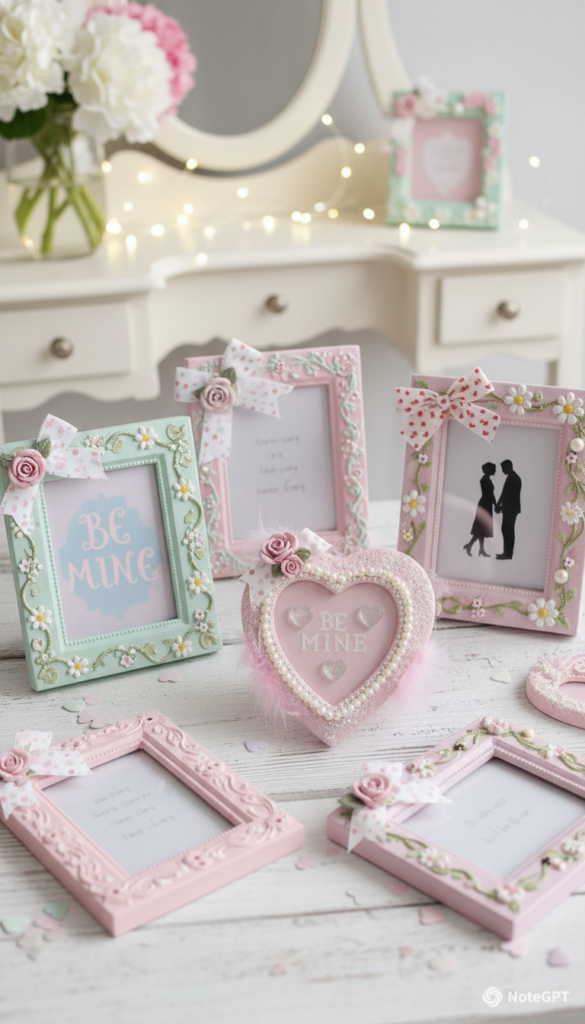 Decorate plain frames with Valentine embellishments. Add glitter, pearls, or faux flowers. Insert group photos or Polaroids. These frames capture memories beautifully. A great décor piece afterward.