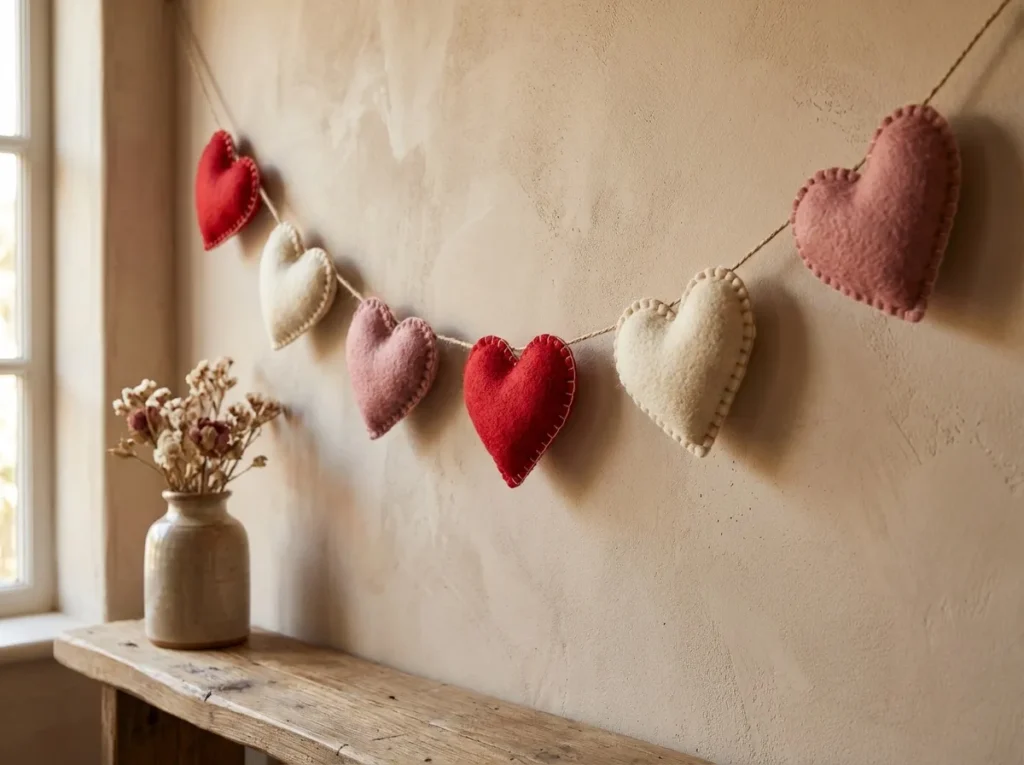 Cut felt hearts and string them into garlands. Mix textures and colors for a playful look. These garlands make great party décor. Easy, budget-friendly, and fun. Great for group crafting.