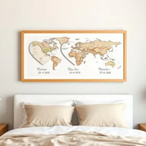 This art piece features three map hearts representing the three most significant locations in your relationship: where you met, where you got engaged, and where you married (or live). It tells the geographical timeline of your journey together in a clean, graphic layout. It is perfect for couples who have done long-distance or moved around together. It visually connects the dots of your life.