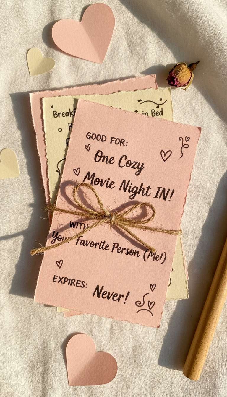Create redeemable love coupons like “Movie Night” or “Free Massage.” It’s playful, romantic, and thoughtful.
