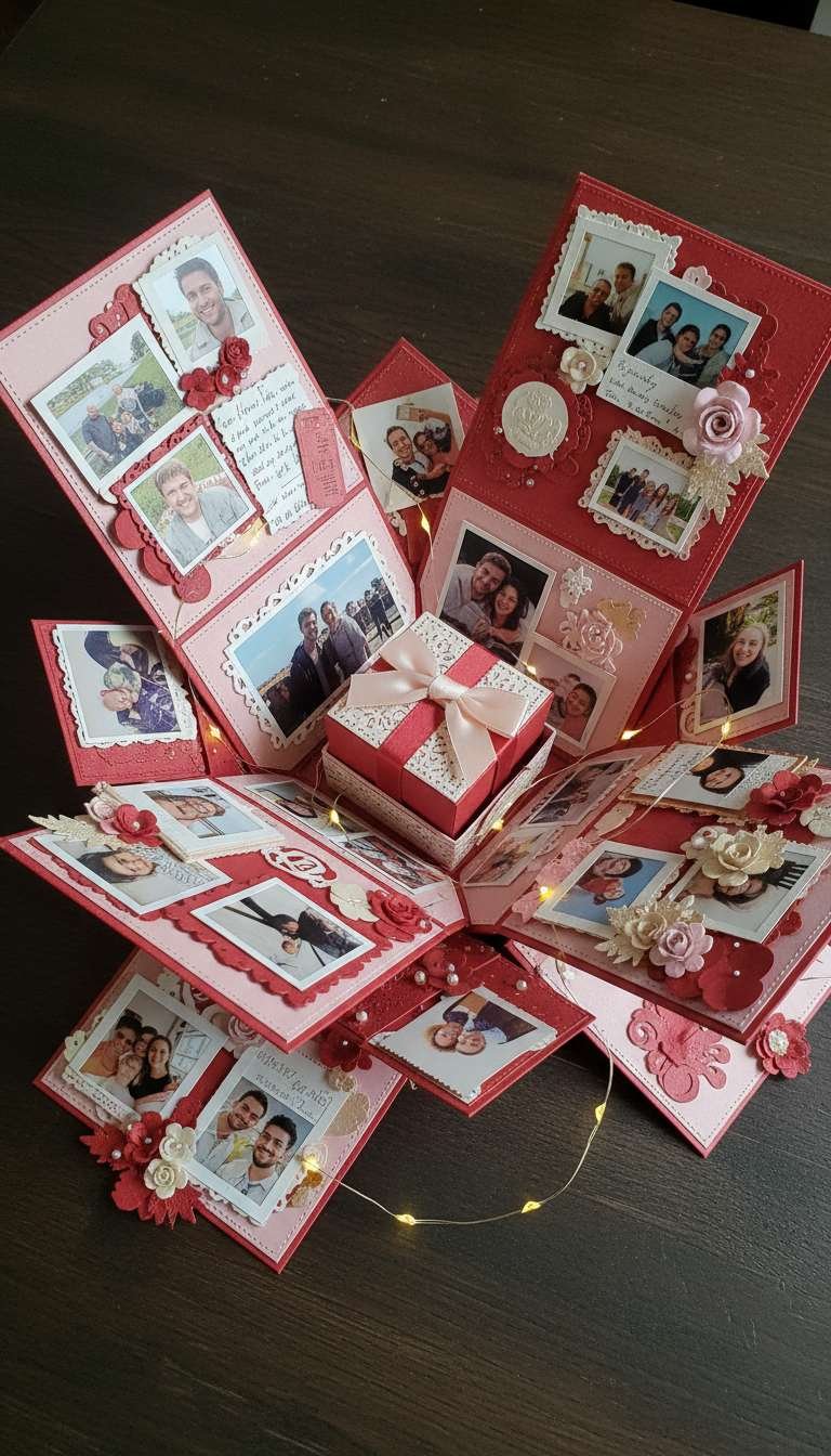 An explosion box opens into layers of photos and love notes — dramatic and unforgettable.