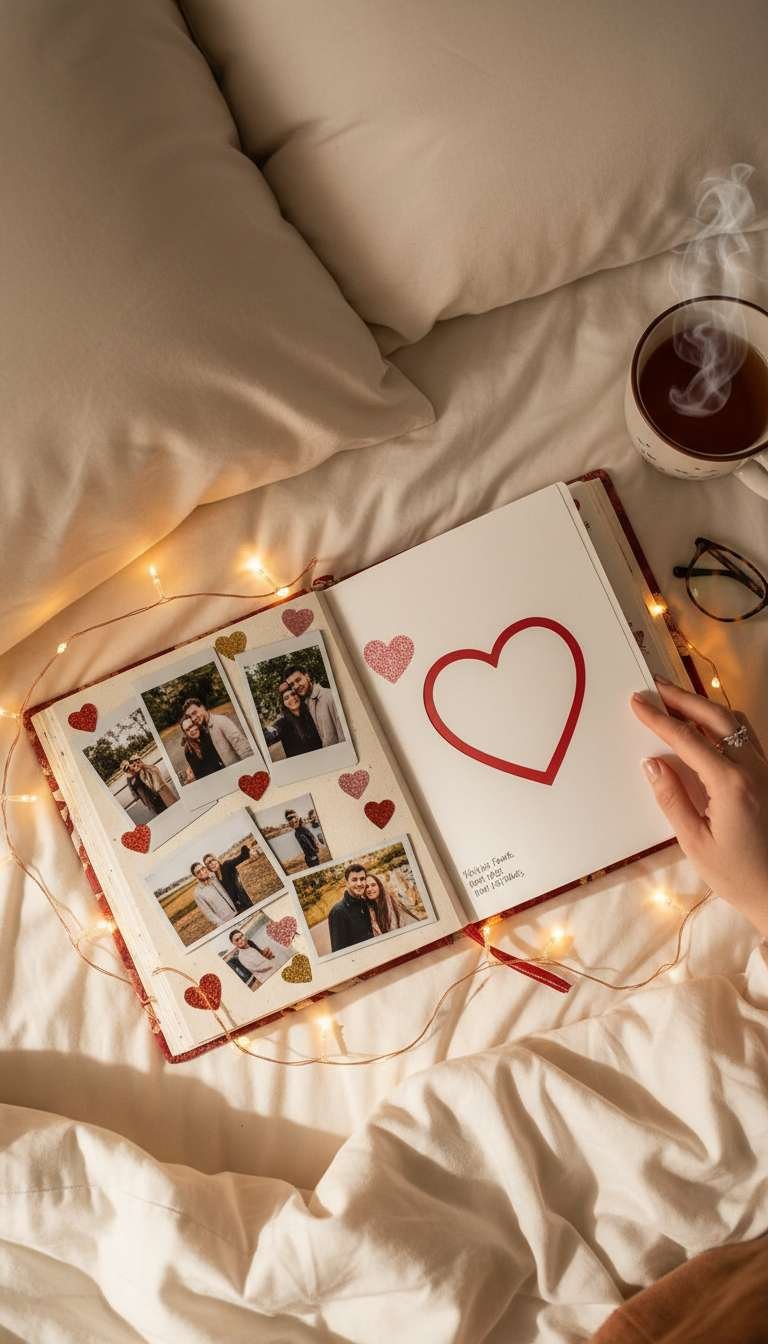 Collect your photos, movie tickets, and sweet notes into a beautifully decorated scrapbook. It’s nostalgic, creative, and incredibly meaningful.