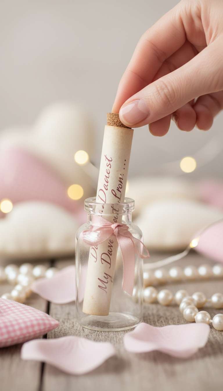 A tiny cork bottle with a rolled love note feels poetic and charming.