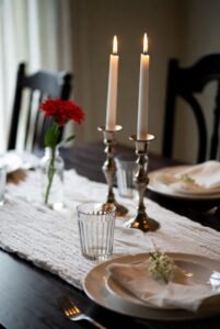 A lace table runner softens your table and adds romantic elegance. Perfect for bridal showers, anniversaries, or intimate dinners, lace works beautifully layered over dark wood for contrast. Pair with gold flatware and soft pastel florals for a dreamy finish.