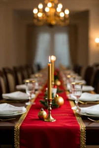 A red runner adds bold color and festive energy to holiday tables or celebratory dinners.