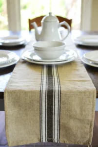 Classic striped grain sack runners add vintage farmhouse character. They’re subtle yet stylish.