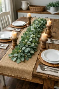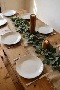 Skip fabric entirely and use a greenery garland as your table runner. Eucalyptus, olive branches, or faux greenery create a fresh, organic look that feels luxurious yet natural.