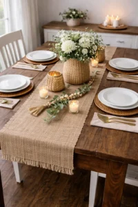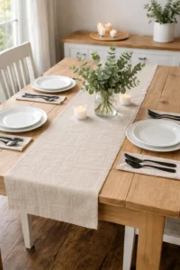 Burlap runners instantly create cozy farmhouse warmth with their natural texture and earthy tone. They work beautifully on wooden tables and pair effortlessly with white dishes, ceramic pitchers, and greenery garlands. For extra charm, layer with lace or add twine-wrapped napkins.