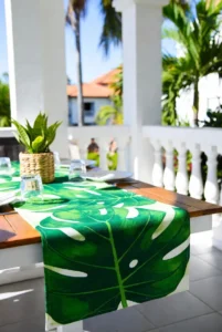 Leaf-print runners instantly brighten summer gatherings and outdoor brunches.