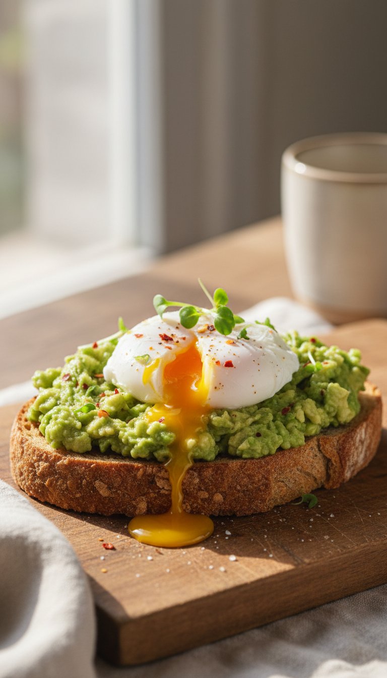 Good fats are crucial for brain function. Avocado on whole-grain toast topped with an egg provides a complete meal of fat, protein, and carbs.