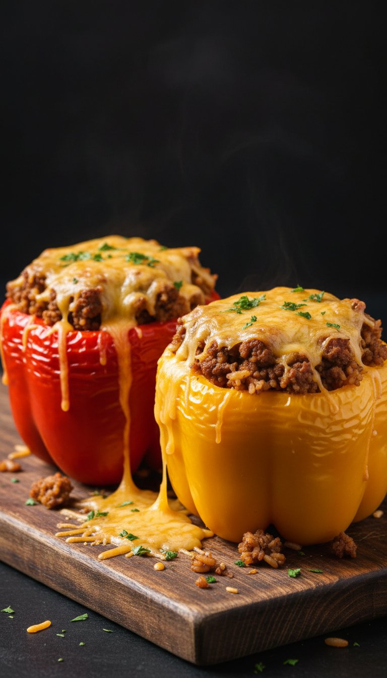 Bell peppers stuffed with a mixture of lean ground beef, brown rice, and tomatoes. They are portion-controlled naturally and look beautiful on the table.