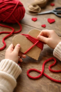 This activity is fantastic for developing fine motor skills and patience in preschoolers and kindergarteners. Cut simple heart shapes out of thick cardboard (cereal boxes work great) and tape the end of a skein of yarn to the back. Have your child wrap the yarn around the heart in every direction until the cardboard is completely hidden. The result is a textured, puffy heart that feels cozy and looks rustic. String them together to make a garland or use them as gift toppers.