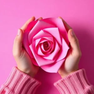 - Prompt 2: A flat lay showing the paper hearts arranged in a line before gluing, with a glue stick and scissors nearby.