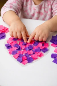 Introduce your kids to the art style of Pointillism using Q-tips (cotton swabs) as their paintbrushes. Cut out a heart stencil and have the kids dab dots of paint around the edge and inside the shape. The tiny dots create a soft, detailed look that is much more precise than finger painting. It encourages focus and creates a unique texture that looks great on handmade cards. It’s an easy way to paint without the need to wash brushes afterward!