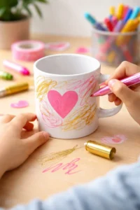Grab some cheap white porcelain mugs and oil-based Sharpie markers for a gift that is practical and personal. Use stickers to create negative space (like a heart shape) or let the kids draw freehand scribbles all over the mug. Peel off the stickers to reveal the clean design, then bake the mugs in the oven to set the ink permanently. These make incredible gifts for teachers, parents, or hot-chocolate-loving friends. It is a designer-looking DIY that even a toddler can help create.